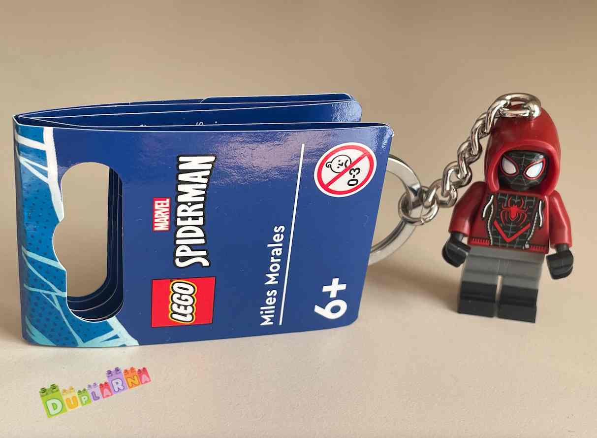 - Přívěsek na klíče s minifigurkou LEGO® – Minifigurka Milese Moralese s polohovatelnou hlavou a rukama je připevněna k pevnému kovovému řetízku s kroužkem. Minifigurku nelze z řetízku sundat